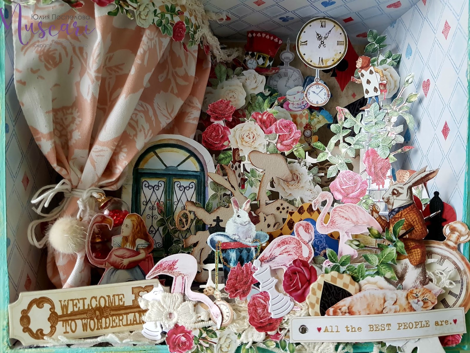 Каждый разворот,каждая страничка-это определенный этап сказки.И конечноже на первом развороте вы видите,как Алиса попала в Страну Чудес.